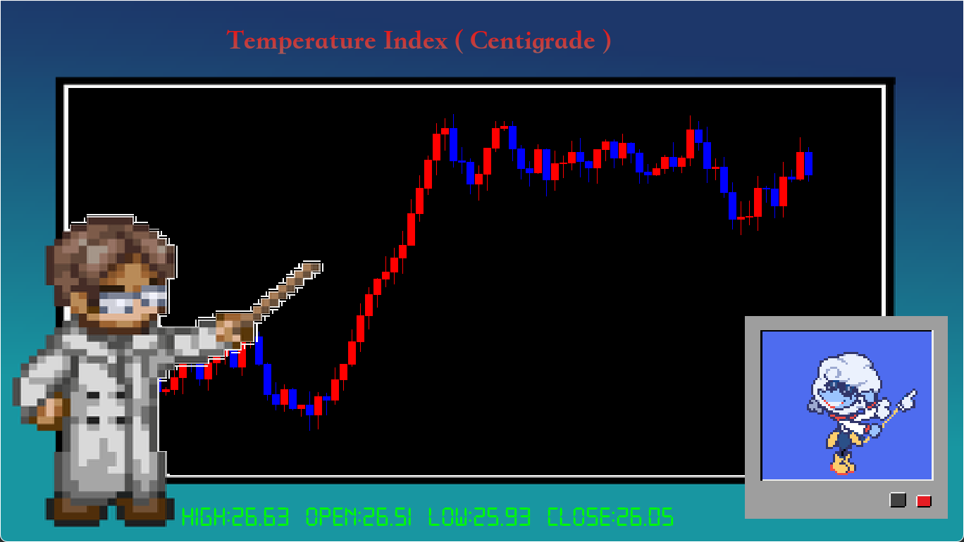 一个心血来潮花了一个下午写的小演示会自动生成随机值并绘制 K 线来显示温度值,您无需做任何事,只需在无聊时展示它,或者用它来表明您或您“OC”的心情。(XD)